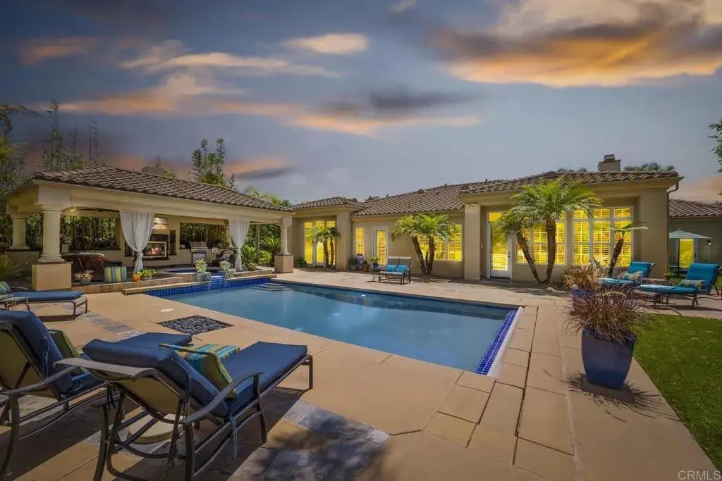 Single Story Aviara Pool Oasis! Located within the private gates of the highly sought after Bella Lago community in Coastal Aviara, this stunning estate home offers a luxurious lifestyle on one of the largest 1/3 acre corner lots in the neighborhood. Steps from the finest beaches in San Diego, this elegant home is situated on a peaceful cul de sac and is truly one of a kind as one of the only single story homes with an expansive bonus room! The resort-style backyard is an entertainer's dream featuring a sparkling pool and lush tropical landscaping with over 20 palm trees throughout the property. Relax in your hot tub by the cozy outdoor fireplace with mounted flat screen or entertain guests in the large outdoor pavillion complete with custom lighting, ceiling fans, built-in BBQ with gas stove and ice cooler. The incredible backyard oasis includes an in-ground water feature, garden, grass area, and 20-foot privacy walls for ultimate seclusion. This home perfectly blends indoor-outdoor living with seamless access to your private resort-style paradise. As you enter the flowing floor plan, you cannot miss the exquisite craftsmanship and custom finishes throughout this spacious home flooded with natural light. Large windows, beautiful stained ceiling beams, crown molding, and plantation shutters create a coastal luxurious feel while travertine and wood flooring, custom built-ins, soaring high ceilings, and the finest finishes complete each room. The spacious front yard with tropical landscaping leads you into a home where tranquility and function are blended together perfectly.