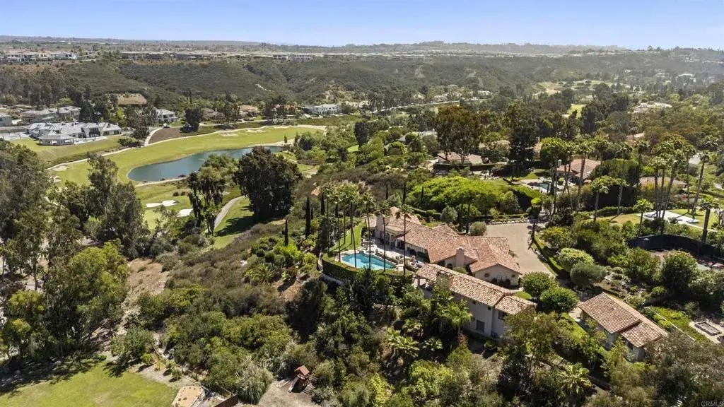Nestled at the end of a cul-de-sac in the highly coveted gated community of Rancho Diegueno Estates, this single-level estate offers an extraordinary blend of serene privacy and sweeping fairway views over the Del Mar Country Club. Encompassing 6,401 square feet on nearly 2 acres of verdant gardens and mature fruit orchards, it is an embodiment of purposeful elegance. Expansive windows and skylights artfully frame the golf course vistas, bathing the interior in light. The thoughtful floor plan includes five bedrooms and six baths, a grand family room centered around a custom stone hearth, a refined living area, and a gracious dining roomall converging on a chefs kitchen equipped with Sub-Zero appliances, an oversized island, walk-in pantry, and serving bar. The grounds set the stage for unforgettable moments: a travertine terrace, covered lounge, pool, spa, and calming water features create a resort-like sanctuary. Indoors, practicality meets luxury with a remodeled laundry room, upgraded baths, and abundant storage. Dedicated spaces for both work and creativity include two officesone purpose-built for crafting and sewingand an additional detached office, discreetly set behind its own entrance. The guest house, an over $1 million jewel, boasts a stone fireplace, wood-beam ceilings, a full bath, and a private terrace complete with grill and chandelier. Beneath, 700 square feet of versatile space awaits transformation into a wine cellar, studio, or gym. Efficiency is seamlessly integrated: with 66 owned solar panels, agricultural water rates, upgraded irrigation, and landscap