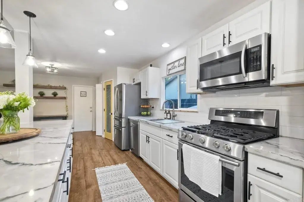 Located in a cul-de-sac, in walking distance to schools, parks, and minutes away from freeways this home is move-in ready. Step inside and youll find fresh interior paint, brand-new carpet with premium spill-safe padding in 2 bedrooms, modern lighting fixtures, and elegant quartzite countertops paired with Samsung kitchen appliances. A spacious walk-in pantry, indoor laundry, and EV charging plug add both convenience and modern functionality. HVAC installed in 2019. Water heater is 1 yr old. The interior shines with newer Pergo laminate flooring, natural stained beams, an ethanol fireplace, and designer touches like a shiplap accent wall in the master suite, double mirrored sliding barn doors, and custom built-in closets. The bathrooms have been updated with newer toilets, tubs, showers, and vanities, blending style with comfort. The backyard is designed for entertaining and everyday enjoyment with a custom Santa Maria grill, a built-in daybed swing, a cozy gas fire pit, and lush landscaping featuring lime and plum trees, birds of paradise, and stately palmsall enhanced by landscape lighting and an in-ground irrigation system. A semi in-ground pool with composite decking completes this outdoor oasis, offering the perfect place to relax and soak up the California sun. Located close to freeways, dining, and amenities, yet offering the privacy and serenity of a retreat, this home combines modern upgrades with timeless charm. With so many features already in place, all thats left to do is move in and enjoy in style.