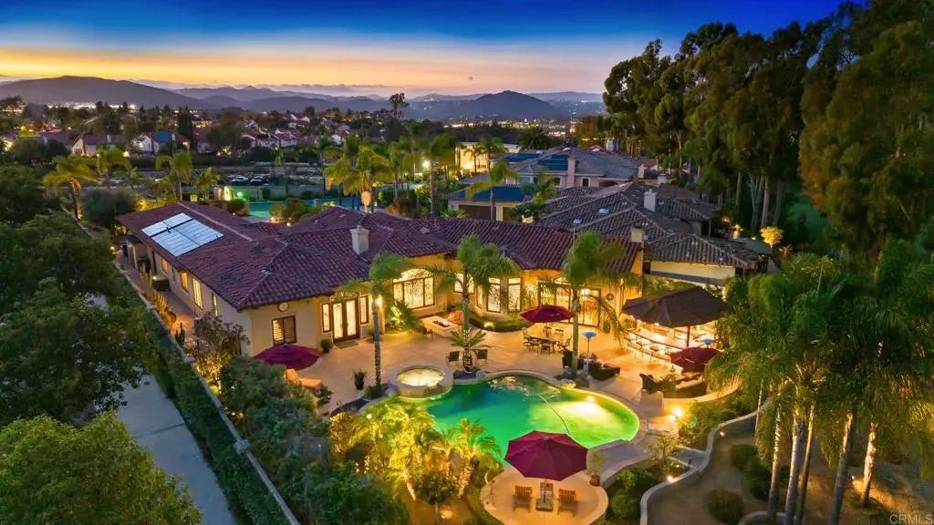 Welcome to 12105 View Pointe Row, an elegant single-level estate in the private 5-home gated community of View Pointe Row in Rancho Bernardo. Built in 2002 and meticulously maintained, this 4,434 sq ft, 4-bedroom, 3.5-bath home blends timeless Spanish Mediterranean design with modern energy efficiency, including owned solar for both the home and pool plus two Tesla batteries. Set on a picturesque lot overlooking the 4th hole of The Heights Golf Club, this residence offers sweeping mountain and fairway views. Inside, the open floor plan is enhanced by arched ceilings, gorgeous crown molding, travertine and hardwood flooring, and additional custom finishes throughout. The gourmet kitchen features granite counters, a walk-in pantry, and top-of-the-line appliances, flowing seamlessly into the spacious family room with its dramatic stone fireplace, entertainment center, and wet bar with wine storage. The primary suite is a private retreat, complete with its own fireplace, a spa-inspired Jacuzzi bath with dual vanities, and a massive walk-in closet. Resort-style living continues outdoors in a backyard designed for entertaining and relaxation. A pebble-tech pool and spa with waterfall is complemented by a covered cooking area and bar top, and generous patio space. Lush landscaping with accent lighting, a rose and herb garden, turf lawn, and drip irrigation system complete the grounds. Additional highlights include a 4-car garage with epoxy flooring, dual-zoned heating and A/C, and Google-integrated speakers and smart-home controls throughout. This pristine home offers a rare oppor
