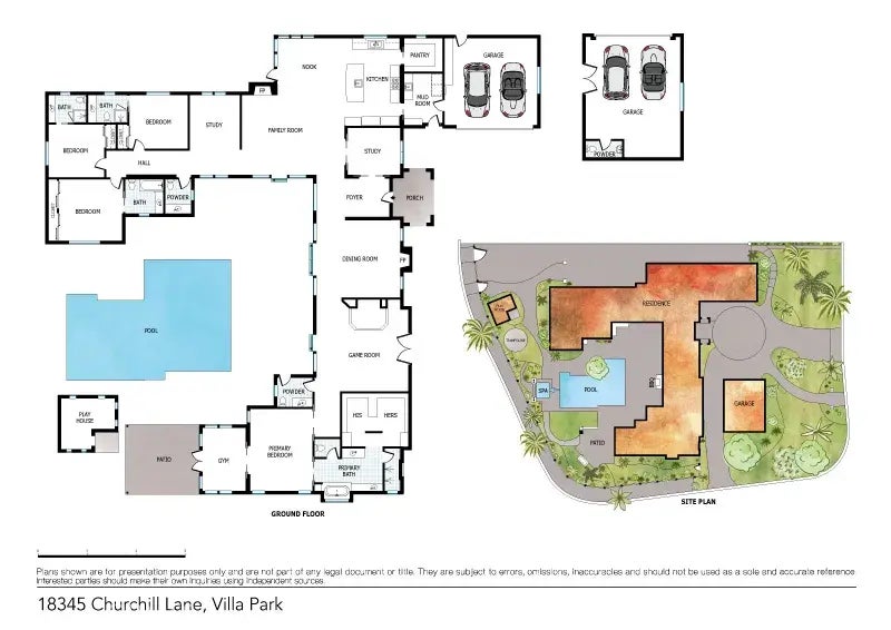 Welcome to 18342 Churchill Lane, an exquisite estate where elegance meets functionality. This sprawling single-story custom home exhibits unparalleled quality offering 4 bedrooms and 7 bathrooms, spread over an expansive 4,337 square feet of sophisticated living space. Step into this meticulously designed home and be amazed by the chefs kitchen, featuring a stunning Calcutta marble island and black leathered granite countertops. Equipped with dual dishwashers, a Wolf Range, microwave/warming drawer, and custom sterling silver drawer cabinetry, its a culinary dream. The kitchen and breakfast nook boast an open layout flowing into the living room, creating a perfect space for everyday living. The first floor also includes an office, a media area, a formal dining room with sliding glass doors, and a bar area with luxurious white onyx countersideal for entertaining. The private primary suite is a serene retreat with a sun room facing the backyard and bathroom complete with a soaking tub and walk-in steam shower. Indulge in ultimate relaxation with a private sauna house and enjoy the outdoors with a sports court with trailer access, or simply unwind in the resort-like backyard. The pool and jacuzzi, complete with captivating water features and flagstone patios, offer a perfect setting for leisure and entertainment. Additional highlights include every bedroom having a beautiful view, its own en-suite bathroom, and closet featuring built-in storage. The garage boasts full built-in cabinets and an additional bathroom, with one garage having A/C. The property is enhanced by practica