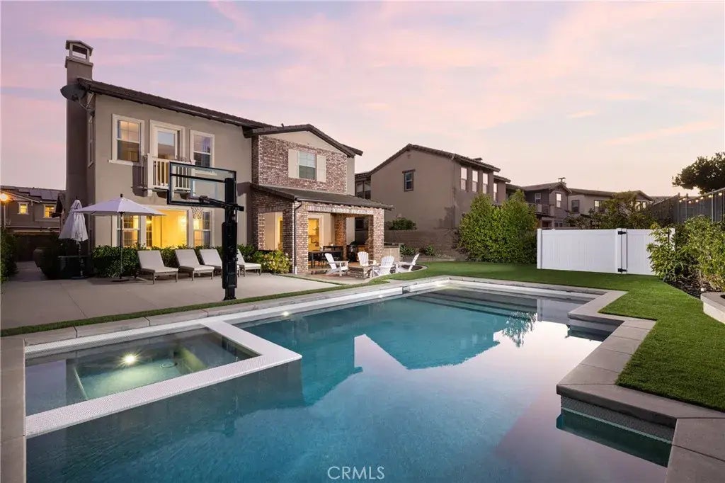 A true gem awaits on one of the most desirable streets in the Cirrus of Esencia community in Rancho Mission Viejo. Positioned on a generously sized lot, this four-bedroom, three-bathroom home spans approximately 2,768 square feet across two levels. Upon entering, the timeless charm of modern farmhouse touchescustom shiplap, crown molding, and elegant craftsman door trimsimmediately captivates. Gorgeous wood flooring leads you into the expansive open-concept living area, where the kitchen shines with KitchenAid appliances, double ovens, quartz countertops, travertine tile backsplash, and a sprawling center island featuring bar seating and a farmhouse-style sink. Further along, a walk-in pantry, built-in shelving, and a dedicated coffee station are showcased. On the main level, a private guest bedroom with full bath are ideal for hosting or use as a home office. Thoughtful design continues with a custom-built mudroom, perfect for storage and organization. Upstairs, two built-in workstations provide an excellent space for study or remote work. Two additional bedrooms, both offering walk-in closets and newer flooring, share a Jack-and-Jill bathroom. One bedroom opens to a charming balcony, offering scenic views of the hills. The primary suite is a serene retreat, featuring a custom shiplap accent wall, dual walk-in closets with newer flooring, and a private balcony overlooking the beautifully landscaped backyard. Its spa-like en-suite bathroom includes double vanities, a soaking tub, and an oversized tiled shower. Outdoors, the private backyard impresses with a built-in fire pi