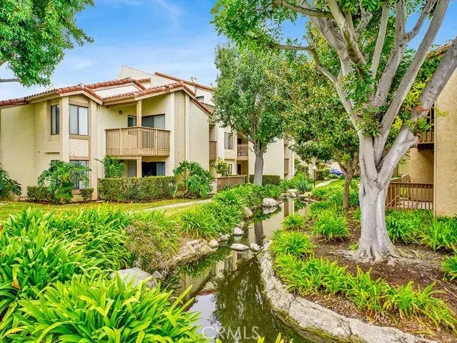 Nestled in the highly desirable Huntington Harbour area, this charming beach-close condo perfectly blends coastal living with everyday convenience. Located in North Huntington, with seamless access to major freeways, this ground-level unit provides an effortless lifestyle with its spacious design. Inside, the home feels remarkably open, thanks to its thoughtful layout, beautiful laminate flooring, and two expansive patios one off the living room and the other off the primary suite, ideal for outdoor relaxation. The living room boasts a cozy fireplace, creating a warm and inviting atmosphere for gatherings. The kitchen is impeccably designed with white shaker cabinets, a farmhouse-style sink, and a pantry, offering a stylish yet functional space for preparing home-cooked meals. The adjacent dining area comfortably accommodates entertaining guests. The primary suite serves as a private retreat, complete with a portable A/C unit for added comfort, an ensuite bathroom featuring dual vanities, a walk-in closet, and a beautifully appointed shower. Two additional generously sized bedrooms provide versatility, with one perfect for a home office or guest room. A separate laundry room, equipped with ample storage, ensures convenience and organization. Adding to the home's appeal is a new hydraulic heating system installed in 2024. Completing the property is a detached one-car garage conveniently located near the unit, along with an assigned parking space. The serene complex features tranquil streams that enhance the peaceful ambiance. Just moments from premier shopping, dining, and
