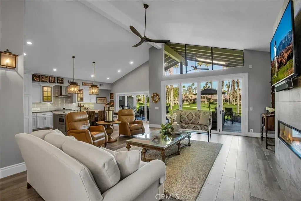 Welcome to The Lakes Country Club where this 2 Bedroom, Den, 3.5 Bathroom Laramie floorplan has been completely redesigned with timeless, sophisticated finishes making this home a true gem! Enter the decorative iron gate to the manicured courtyard and you will note the custom, oversized entry door is waiting for you to begin your journey. Stairs and walls have been removed creating a seamless flow: an open airy environment with soaring vaulted ceilings and an abundance of light. The perfect place for relaxing or entertaining friends and family. The soft, neutral palate is anchored with ceramic tile flooring throughout the main living areas. Walls are washed in a soft grey tone and white doors and trim create a striking contrast. The contemporary, electric fireplace in the great room offers warmth and ambiance and accordion doors to the patio create that much sought after indoor/outdoor vibe. The kitchen is grand with plenty of storage and space for culinary creations! The crisp white cabinets with glass accents and distinctive hardware are complimented with low-maintenance quartz countertops and top-notch stainless-steel appliances, including a wine refrigerator. From this area, patio doors open to a partially covered, expanded patio with built in grill and plenty of space for al fresco dining or watching the golfers on the 6th green of the Palms course. The den has been expanded by the conversion of the atrium to an office with a built-in desk. The guest bedroom is inviting and convenient for guests with an ensuite bath. The spacious primary suite is adjoined to the primar
