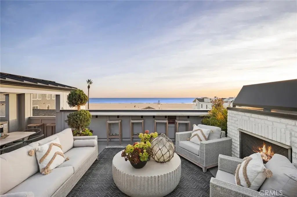 The ultimate beach-chic coastal retreat for wave riders and beach lovers alike! Situated just steps from the sand this vibrant ocean-view home embraces the spirit of surf culture. Here vacation vibes are complemented by sophisticated custom finishes and luxurious appointments throughout. Open, airy spaces are flooded with natural light and floor-to-ceiling walls of glass invite in the ocean breezes and whitewater views. The open-concept living area allows for stylish entertaining, and is anchored by a statement fireplace and ocean views. The adjoining professional-grade kitchen features a suite of WOLF/SUB-ZERO appliances, a large central island, and a design-forward layout that makes cooking and entertaining effortless. The adjacent dining alcove sets the stage for memorable meals with family and friends. With three bedrooms and a den, the primary suite is situated on the main living level and is highlighted by high ceilings, a spa-inspired bath and generous walk-in closet. Designed as the ultimate outdoor living space the third-floor rooftop deck offers sweeping ocean and city views, and combines style, comfort and functionality for both relaxing and entertaining in style. With both covered and uncovered spaces, a fireplace, and an impressive outdoor kitchen complete with beer-on-tap it is the ideal spot to gather for meals al fresco as the sun sets behind Catalina. Additional amenities of this coastal home include an elevator, Lutron home automation, three car parking to include a two car garage and an enclosed carport, an outdoor beach shower, bespoke interior lighting,
