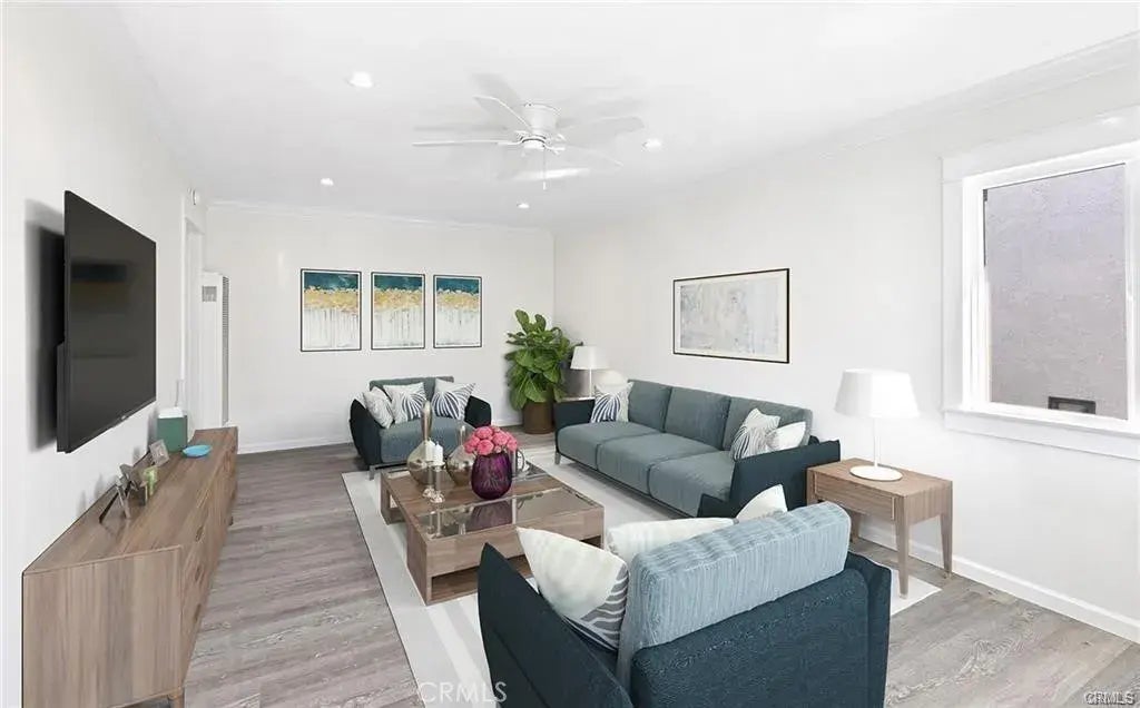 Remodeled two bedroom , one bath lower unit. Newer flooring, kitchen cabinets, counters, appliances and fridge. Recessed lighting , ceiling fans, crown moulding, bathroom., windows etc. Unit comes with washer/dryer in separate closet however machines are not shared with other units. Designated patio/rear yard. No A/C. Fantastic opportunity to live by the beach and be the first to occupy this renovated unit. Detached garage, one shared spot in two car garage. MUST have excellent credit, reserves. Sorry no dogs, cats ok.