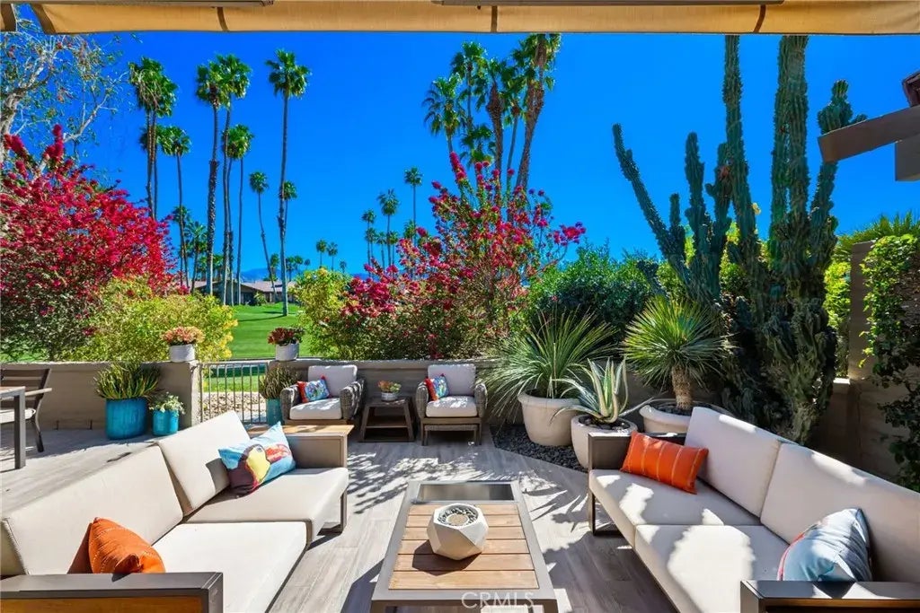 Welcome to The Lakes Country Club! This approximately 1,858 sq ft El Paso floorplan with 2 bedrooms, den and 2 bathrooms has been totally re-imagined in a sleek, contemporary style that welcomes you from the moment you enter this home. The gated courtyard is lush with an interesting landscape design and custom lighting delightfully setting the stage for whats inside. Upon entry you feel the warmth of the carefully blended tones and textures of the luxurious finishes and furniture begging you to stay and enjoy this relaxing vibe. The split stone fireplace is the focal point of the living area and blends beautifully with the luxury vinyl plank flooring that runs seamlessly throughout the main living areas of the home. The kitchen has been designed with European-style matte slab cabinets, gleaming quartz countertops and a unique backsplash. The oversized island offers plenty of storage and seating for small gatherings and the built-in wine refrigerator accommodates 66 bottles. The atrium has been enclosed and converted to an intimate dining area with skylight and a distinctive pendant light fixture. The den is currently used as an office and media room and the guest bedroom has a convenient ensuite. The primary suite is grand with soaring vaulted ceilings and designer wall treatment which adds texture and warmth. The spa-like ensuite is finished in soft, neutral tones with low maintenance quartz countertops and porcelain tile shower. The south-facing patio is landscaped for privacy with exotic Desert scape but still features stunning mountain and sunset views. With tile floor