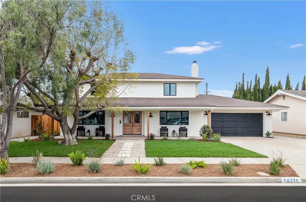 Welcome to 14711 Mimosa Lane a completely reimagined masterpiece of modern luxury living. This stunning 2,443 square foot, 4 bedroom, 3 bathroom home offers the epitome of elegance, sophistication, and Southern California living. Every detail has been carefully curated to create a seamless blend of style and comfort. Nestled on a quiet tree-lined cul-de-sac, you're welcomed by natural wood touches, newly landscaped grounds, and a charming curb appeal. Step inside through the custom doors and enter a light-filled great room featuring two cozy fireplaces to gather around and an effortless indoor-outdoor flow. The heart of the home is the gourmet kitchen, centered around a breathtaking waterfall natural stone island, complemented by bespoke lighting, high-end appliances, walk-in pantry and top-tier finishes. Two sets of bi-fold doors open completely off the dining room and formal living area, creating a true indoor-outdoor living experience, perfect for entertaining or relaxing in the California sun. A bedroom, full bathroom with curated finishes and chic mudroom and laundry area round out the downstairs interior. Retreat upstairs to the primary suite with walk-in closet and a spa-like bathroom adorned with designer tile and premium fixtures. An additional bathroom and two more bedrooms complete the upstairs living area. The serene backyard is your own private oasis, complete with a sparkling pool and spa and ample entertaining space. Expertly designed touches are found in every corner, from the lighting selections and custom wallpaper to the detailed woodwork. Major upgrades