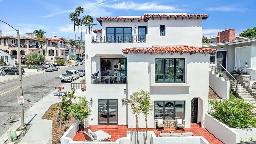 Set on a prime corner lot in San Clementes sought-after Pier Bowl, this brand-new luxury townhome showcases ocean and village views and blends elevated coastal living with refined modern design. Never occupied and built with todays lifestyle in mind, the three-level residence features a private elevator, premium finishes, and a rooftop deck designed for entertaining against a scenic backdrop. The ground level offers a spacious two-car garage, a large front patio, a welcoming entry-level living space, and an en suite bedroom with French doors opening to the outdoorsideal for guests or multigenerational living. A dedicated laundry room adds everyday convenience. The main level is ideal for entertaining, with a fireplace-warmed living room, six-foot windows, and accordion glass doors that extend the living space onto a generous deck. The open-concept dining area flows into a chefs kitchen featuring abundant white cabinetry, a Zephyr wine fridge, quartzite countertops, a large island with bar seating, and top-tier Wolf and Sub-Zero appliances. A separate office or den adds flexible functionality. Upstairs, two secondary bedrooms share a sleek full bath, while the primary suite impresses with its private view deck, spacious walk-in closet, and spa-like bath with dual vanities and a large walk-in shower. Crowning the home is a rooftop deck with panoramic coastal views, complete with a fireplace and integrated outdoor kitchenette with BBQ and prep sinkperfect for entertaining under the stars. Throughout approximately 2,675 square feet, wide-plank hardwood floors, designer fixtures
