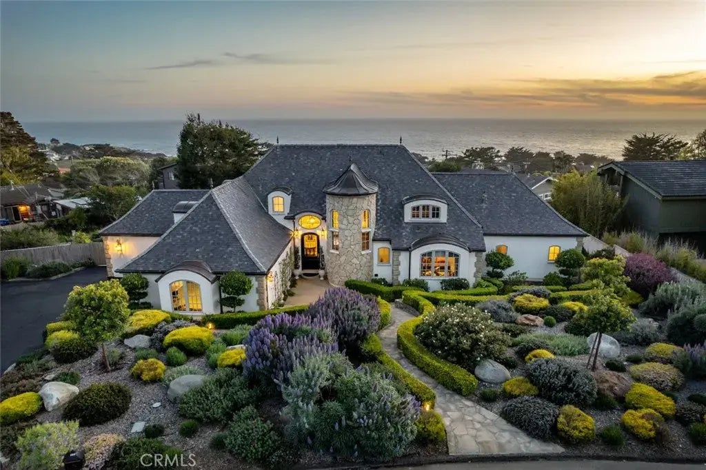 Nestled on over half an acre of beautifully maintained grounds with ocean views, this estate represents the perfect blend of luxury, tranquility, and thoughtful design. Located in the highly sought-after Lower Leimert area of Cambria, this exceptional property is positioned at the end of a peaceful cul-de-sac. The home itself is a masterpiece of craftsmanship and the attention to detail is apparent from the slate roof to the polished natural stone floors, and high-end Anderson windows. Most rooms have beautiful ocean and garden views. The heart of the home is its chefs kitchen, which has been fully remodeled using the finest materials. Featuring leathered granite, white Mikonos quartzite and custom solid wood open shelves and cabinetry with soft-close features. Sub Zero refrigeration and a professional-grade range makes the kitchen a dream. This meticulously custom-built residence features 3 generously sized en-suite bedrooms located on the lower level, each designed with attention to detail and comfort. The luxurious primary suite that spans the entire upper floor offers a true sanctuary, with expansive windows and a veranda providing views of both the private gardens and ocean. The suite features a barrel ceiling, allowing natural light to flood the space. The spa-inspired bathroom features a jetted soaking tub, a steam shower, and dual vanities. In addition to the luxurious bath, the flexible floor plan within the primary suite is perfect for a range of uses, whether as a private gym, an office, a family room, or the fifth bedroom. The beautifully landscaped gardens have