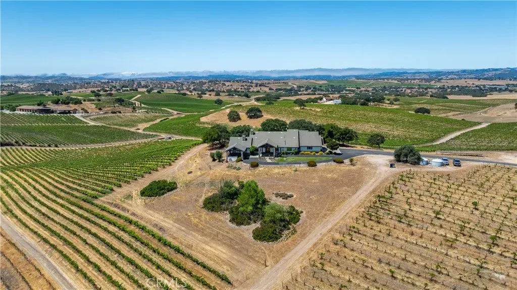Perched on a scenic knoll with sweeping 360-degree views, this remarkable 80 +/- acre estate offers exceptional privacy, space and timeless craftsmanship in the heart of the Central Coast. The custom-built main residence, completed in 1999, spans approximately 4,649 +/- sf and showcases quality wood-frame construction, stucco siding and a concrete tile roof. Inside, the 4 BD and 3.5 BA are thoughtfully arranged for both comfort and functionality. The dramatic great room is a true centerpiece, featuring vaulted ceilings with exposed oak beams, a floor-to-ceiling gas fireplace, and a wall of windows framing panoramic vistas. Designed for both everyday living and grand entertaining, the home also offers a formal dining area, a wet bar, a casual dining nook with built-in oak hutch and desk, and a well-appointed office with custom cabinetry. The chefs kitchen blends style and practicality with Corian countertops, a cooking island with bar seating, custom oak cabinetry, built-in refrigerator, and double convection/conventional ovens. The luxurious primary suite is a private retreat with dual walk-in closets, a spa-inspired bath with Jacuzzi tub, separate shower and vanity islandplus direct access to a Trex deck with a 220V hookup for a hot tub. A separate guest wing includes three additional bedrooms, one with an en-suite bath. Outdoor entertaining is elevated with a covered kitchen area complete with built-in BBQ, sink and seating area overlooking the rolling landscape. A detached 1,278 +/- sf secondary residence, built in 2006, features 3 BD, 2 BA, and comfortable living spaces
