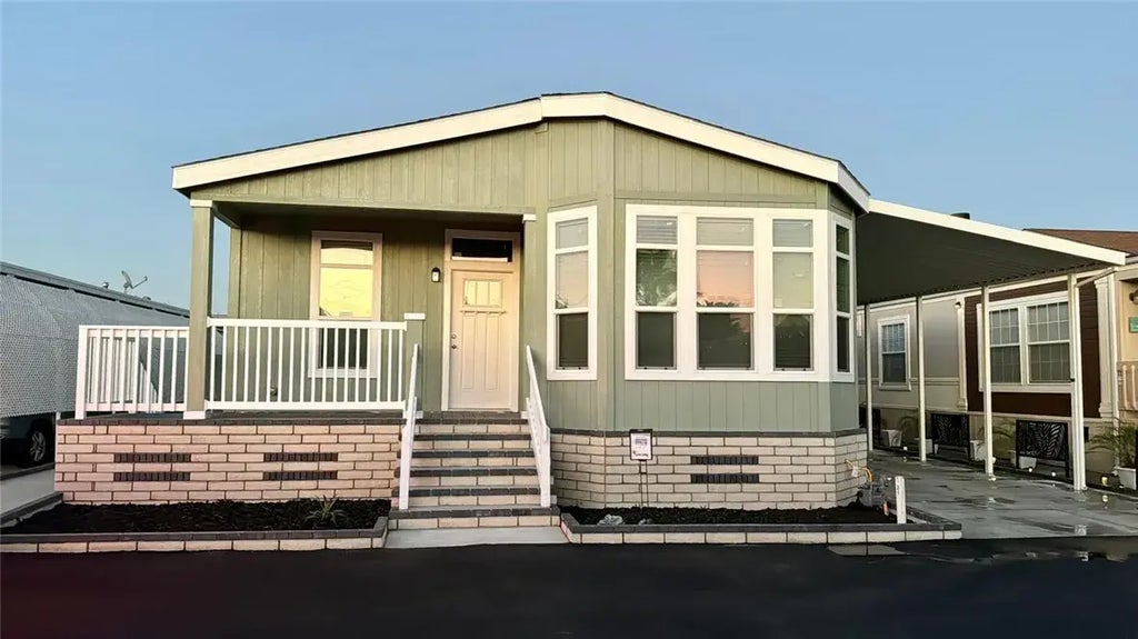 Senior Living at Its Finest! Discover the charm of resort-style living at Brookfield Manor in Huntington Beach. This brand-new 3-bedroom, 2-bathroom home offers a range of high-end upgrades, including soaring 9-foot ceilings, a spacious kitchen island with stainless steel appliances, quartz countertops, elegant coffered ceilings, and a welcoming front porch. Additional features include premium flooring, custom masonry planters, skirting, and a newly installed concrete driveway. This stunning home is move-in ready. CALL NOW! Please note, prospective residents must meet park residency qualifications.