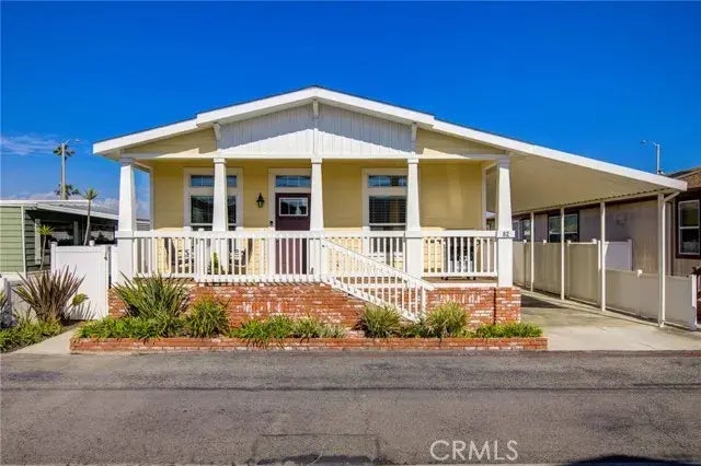 Experience coastal living at its finest with this impressive home in the sought-after Huntington Shorecliffs community of Huntington Beach. As an added bonus, the seller is offering a special incentive toward the monthly space rent, making this an even more attractive opportunity. The grand covered front porch, lush landscaping, and a 2-car carport enhance its curb appeal. Inside, the open floor plan seamlessly connects the living, dining, and kitchen areas, creating a welcoming space for relaxation and entertainment. Practicality meets style with a laundry room and storage area accessible from the kitchen and carport side entrance. The home features two well-appointed bedrooms and a luxurious main bedroom with an en suite bathroom that includes an expansive walk-in closet. The main bathroom boasts dual vanities and a spacious shower. Outside, the backyard includes a modest patio space and a large storage shed, providing ample storage or workshop space. The side yard is well landscaped and versatile, ready for your personal touch, whether you envision a serene retreat, a children's play area, or a putting green for golf enthusiasts. Residents of this exclusive community enjoy a range of amenities, including pools, spas, a clubhouse, billiards room, poker room, fitness center, and BBQ areas. A pedestrian gate provides easy access to Huntington Beach's Pacific City, Main Street, and pier. Embrace the coastal lifestyle and make this California home yours.