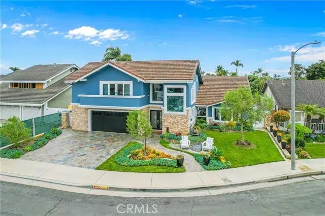 Indulge in coastal luxury within this meticulously remodeled home on a quiet cul-de-sac steps away from the Bolsa Chica wetlands. It is masterfully designed and includes a rare full-bedroom suite downstairs and another spacious bedroom suite on the second floor; the perfect floorplan for the multi-gen family; 4 bedrooms, a two-desk office/safe-room, & 3 full baths. The grand entrance has a custom glass door, a magical sunlit foyer, topped with a flawless Lightopia chandelier. Throughout the home, several Restoration Hardware chandeliers and Pottery Barn pendant lights illuminate the space. The kitchen has a luxurious feel with glossy marble countertops, a Brizo faucet, a U-Line wine fridge, and elegant custom cabinets. The main floor boasts impressive vaulted ceilings and a versatile layout with a spacious, great room-style living area with a custom marble fireplace and elegant French doors open to a charming side yard. Additionally, the main level includes three bedrooms, including a luxurious bedroom suite with a generously sized walk-in closet and a lavish bathroom. New baseboards and beautiful Shaw waterproof flooring add the perfect finishing touches. The 4th bedroom is on the upper level and is truly grand. It has a dramatic entrance, cathedral ceilings, a Restoration Hardware chandelier with matching sconces, skylights, a Juliet balcony, and a lavish bathroom. The bathroom showcases a luxurious standalone soaking tub, dual vanities, marble tile in the shower, a Toto Washlet bidet, an exquisite bell-curved skylight, lighted mirrors, and an expansive custom California