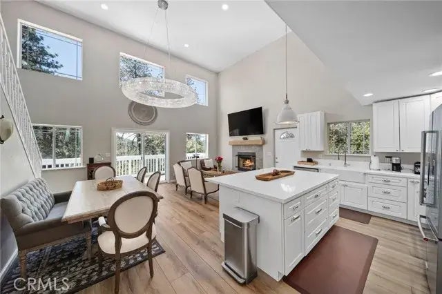 Escape to the ultimate luxury mountain retreat with this stunning all-season home offering unparalleled views and exceptional living spaces. Recently renovated, the house features new luxury vinyl flooring throughout and a chef's kitchen complete with a spacious island and top-of-the-line KitchenAid appliances, including a refrigerator. Nestled on a private hillside with expansive 180-degree mountain forest views from its large south-facing balcony, this home ensures breathtaking sunrises and sunsets are a daily delight. Enjoy the serenity of no neighbors to the left or behind on the expansive 6000 square-foot lot, perfect for adding additional space or creating a captivating backyard oasis. Inside, high ceilings and ample windows flood the interior with natural light, complementing the cozy ambiance of the gas and wood-burning fireplace in the living room, adorned with a striking Restoration Hardware chandelier. With three bedrooms plus a loft, two featuring expansive walk-in closets, and luxurious master and guest bathrooms recently remodeled with an extra-large Jacuzzi tub, comfort and style abound. Additional highlights include AC and a new energy-efficient AC condenser ready for installation, plentiful parking at the end of a quiet cul-de-sac, and proximity to local amenities such as the newly reopened Goodwins grocery store just a five-minute drive away. Enjoy outdoor adventures with Lake Gregory just five minutes away, offering paddleboarding, kayaking, trout fishing, Duffy boat rentals, and more, while local bars and eclectic shopping are also within a short drive.