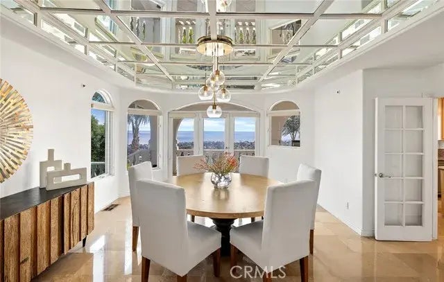 Gracing the side of a scenic hill in San Clemente, this exquisite custom home offers a private world of luxury and prestige that is embellished with panoramic 180 ocean views embracing breaking waves, lush fairways, Santa Catalina and San Clemente islands, and the enchanting coastline as far north as Dana Points rugged Headlands. Distinguished by impeccably maintained landscaping, and handsomely detailed Spanish architecture with leaded-glass entry doors, bold columns and fresh white paint, the three-level residence extends approximately 5,215 square feet and offers views from each floor. The main level is extraordinary, with towering ceilings soaring over a fireplace-warmed living room, formal dining room, and a dramatic semi- circular staircase. Large windows expanses and multiple sets of French doors open to views and welcome an abundance of natural light that illuminates tile and wood flooring, romantic archways, and elegant lighting fixtures. Living areas on this level offer access to a full-width balcony and large view terrace, where casual barbecues and formal cocktail parties are equally accommodated in style. Four ensuite bedrooms and four- and one-half baths include two top-floor secondary suites that share an ocean-view balcony and a bath. The opulent primary suite is located here as well and reveals an ocean-view retreat, three-sided fireplace, a private balcony, oversized walk-in closet with built-ins, a bar, and a lux bath with spa tub and separate shower. Downstairs, a massive bonus room welcomes views of the Pacific and opens to an intimate patio. Additional