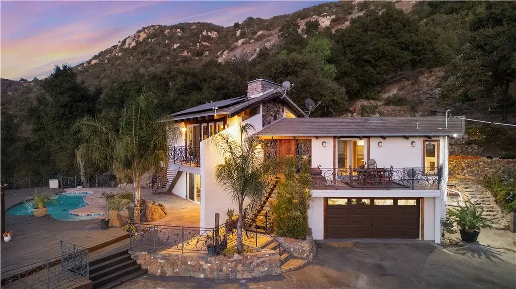 VIEWS VIEWS VIEWS!! This home offers tremendous potential. This property is perfect for anyone seeking ultra-privacy, paid solar, and secluded living, the home is surrounded by natural trails and is just a short walk from a waterfall on neighboring land.Nestled on 22 acres within an exclusive gated enclave of only five custom homes, this property boasts breathtaking panoramic mountain views. Perched atop a private hill and accessed via a long private road with gated driveway, this architectural custom home provides a serene retreat with stunning surroundings. The timeless design is enhanced by fresh exterior paint and solar power, complemented by large glass doors that open to a lavish outdoor oasis. Enjoy a freshly painted deck, private pool, and spacious patios for entertainment.The entry features a hand-carved Honduran mahogany door with colorful stained glass, leading to an airy foyer. Open concept kitchen with breakfast nook and built-in secretary desk, custom cabinets, granite counters, stainless steel appliances, and dining balcony. The main living area has vaulted beamed ceilings, a natural rock fireplace, and wood flooring. Sunrise and sunsets are visible from every window throughout. The primary suite includes a private patio, vaulted ceilings, and a spa-quality bathroom with marble floors and an expansive walk-in shower. Near the living area on the main level is a guest bedroom currently being used as an office. In addition, the main level has a half bathroom and dining area. Downstairs, a second family room features engineered wood flooring, a natural rock firep