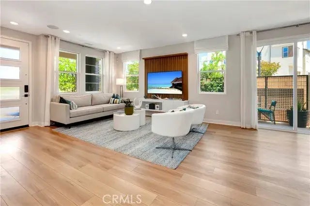 Fully Furnished Model home! End unit! Next to the park with a park and mountain view! Brand New furnished model home with paid solar. This Model Home is full of upgrades. You, indeed, can have it all. The Home is next to the park and pool. The Home's highlight is the kitchen, which features upgraded quartz island countertops, a full-height tile backsplash, and modern upgraded white cabinets; stainless steel appliances, including a refrigerator, sound system speakers, and an upgraded walk-in pantry to complete the package. The living room has decorative panel walls, a flat-screen TV, and sound system speakers, while the dining room has frame windows. All bedrooms are on the second floor. The main bedroom has decorative panel walls, modern light, and a balcony. The hallway has an upgraded desk area with drawers. The side yard is professionally landscaped and hardscaped with trees and a waterfall. For convenience, the laundry room has a washer and dryer, upgraded upper laundry cabinets, and a faucet sink. The garage has upgraded storage cabinets, epoxy flooring, an EV charger, and a tankless water heater. Residents of this Home have access to the community pool, park, and all the amenities offered in the Great Park Neighborhood. The Home is zoned to the prestigious Irvine School District and is within walking distance of Solis Park K-8 school, Solis Park, and community pool.