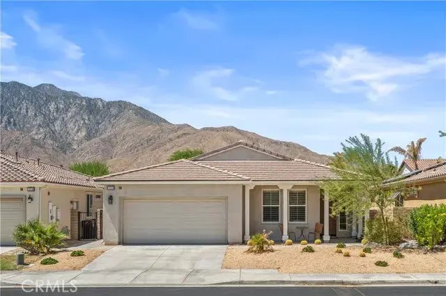 Welcome Home to this turn-key mountain view home in the 55+ gated community of Four Seasons. FULLY PAID SOLAR! GORGEOUS PEBBLE-TEC POOL, OPEN FLOOR PLAN! This 2 bedroom plus den, welcomes you into a large living room with a gas fireplace and plenty of space to welcome guests. This home has a wonderful layout that brings the living room, dining room and kitchen together, all showcasing views of the backyards deep blue pebble-tec pool and jacuzzi. The spacious kitchen boasts an oversized kitchen island, cherry wood cabinets, and sparkling granite countertops. Windows throughout feature large white shutters. Tucked in the hallway is a generously sized laundry room with a brand-new washer and dryer, and the garage has new epoxy flooring, its own split-ac unit and is stubbed for EV charging! Its walls are lined with storage cabinets. The Primary bedroom opens right out to your backyard oasis, while the bathroom features two large walk-in closets, a soaking tub, dual sinks and a walk-in shower. Secondary bedroom has large windows and is privately located away from the Primary. This home also includes newer Solar, which seller will pay off completely at close! The Four Seasons community is minutes from Downtown Palm Springs, walking trails, and offers countless amenities. Frontier Internet is newly included with the low monthly HOA fee! This home is turn-key and ready for someone to make it their own! Enjoy the clubhouse, swimming pool, banquet center, multiple sports courts, library, and live the Palm Springs Dream! This home has it all!