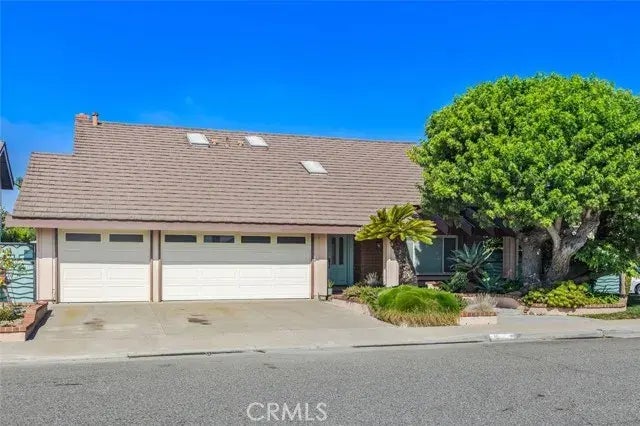 Look no further! This great two-story home is situated on a large, approximately 7,280-square-foot corner lot less than 15 minutes from the sand and surf of Huntington Beach. Step through the double-door entryway to find a light-filled space featuring ample picture windows throughout, elegant wainscoting, tile and luxurious leather flooring. The cozy fireplace and oversized bay window give the formal living room a homey ambiance. The traditional dining room located through the double doors has been used in recent years as a study and remote office. Unwind in the great room with a custom media center, dry bar, built-in wine rack and glass rock fireplace. The space serves as both a living room and a large dining area adjacent to the open kitchen made for entertaining. It features wood cabinetry, a garden window, a prep island and glass sliders opening to the patio, ideal for al fresco dining and sunset refreshments. Enjoy picturesque manicured grounds with a lush lawn, pristine hedges, mature trees, a retractable awning, a hot tub and an outdoor shower for post-beach-day convenience. Head up the staircase to find the spacious primary suite with large reach-in closets, a third fireplace and a bathroom with a private water closet and shower. All three secondary bedrooms are located upstairs and share a spacious full bathroom with a tub-in-shower. The fully owned solar panel system is ideal for powering the many entertainment devices throughout the home. These include a Sonos built-in sound system and multiple flat-screen televisions. There is ample storage in the attic space of