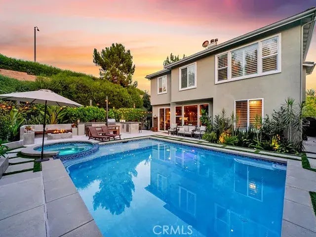 Discover a rare opportunity to own a stunning residence in San Clemente's exclusive gated community, The Reserve South. Situated on a large flag lot at the end of a tranquil cul-de-sac, this home epitomizes coastal living. The impressive curb appeal and serene setting welcome you, with a spacious front yard offering a shaded seating area for relaxation. The driveway fits up to six cars, complemented by a three-car garage. The expansive backyard is a private oasis with a resort-style Aldrete-built pool featuring a Baja shelf, oversized spa, and an Endless Pools swim machine for exercise and leisure. The polished concrete barbecue island, with a GE Monogram grill, outdoor refrigerator, and built-in cabinets, is perfect for al fresco dining. Enjoy cozy evenings by the fire pit with built-in seating or festive gatherings under the professionally installed party lights. An outdoor shower with hot and cold water adds convenience after a beach day, while lush landscaping and custom lighting enhance the backyards resort-like ambiance. Inside, the home boasts an inviting open floor plan ideal for entertaining. The family room, featuring French oak flooring, opens to the kitchen and views of the backyard. The gourmet kitchen includes high-end appliances: a Dacor refrigerator, Bosch dishwasher, GE Monogram stovetop, and GE Profile oven/microwave. A paid solar power system with 30 panels ensures minimal electricity bills. The main floor features a spacious bedroom and full bathroom, perfect for guests or multi-generational living. Upstairs, a generous loft with built-in cabinets and su