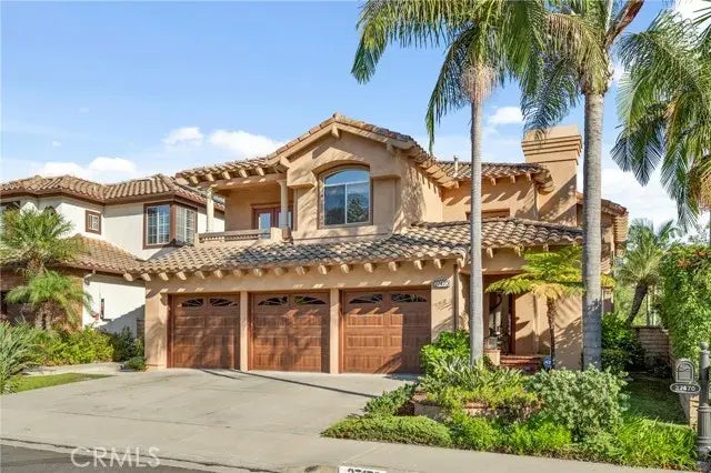 Upscale excellence of Pacific Hills community; Bonaire, Altare Plan 2815 sq. ft., 2 story, 4 bedrooms (one guest bedroom main floor), 3 baths, 3 car attached garage, private cul de sac location, raised view of homes & hills; near shops, restaurants. Pride of ownership, recently updated, interior/exterior recently repainted. Vaulted ceilings, Travertine floors, custom granite living room fireplace; elegant circular stairway, formal dining room with decorator column room separators, glass chandelier., custom bevel glass doors to back yard. Kitchen remodeled with dark cabinetry, granite cover counters and service areas; Bosch 5 burner top range, double ovens, built in microwave. Breakfast nook with 3 side windows. Family room with black granite wet bar, granite covered fireplace, high ceiling. First floor with guest bedroom & upgraded full bath; inside laundry. Second floor with master bedroom suite and 2 guest bedrooms. Luxurious Master bedroom suite, raised bed platform area, dressing area leads to enclosed balcony, see through fireplace separates master bath with bedroom. Custom Master bath suite with spacious raised jacuzzi bath, quartz coated bath; custom tiled walk in glass enclosed shower; walk in closet, enclosed commode. Two large guest bedrooms enjoy remodeled guest bathroom with double sink, bath & shower. One guest bedroom has double doors leading to enclosed view balcony. Downstairs main-floor bedroom/den next to full bathroom. Exterior rear yard has a glass enclosure, AC system on platform relocated to enclosed side yard; outside house windows/trims reinsulated w
