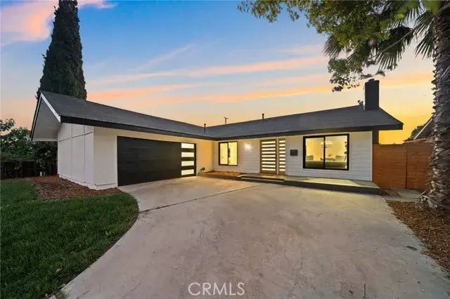 The home that you have been patiently waiting for is finally available. Everything you want and need is right here. The moment you pull up, you will notice The Modern Ranch style with the black and white color that brings a timeless look to your new home. Walking through the front door, you will love the open floor plan for entertaining or lounging. There is new vinyl plank flooring throughout the home, recessed lighting, black windows & sliding doors, and natural lighting in every angle of the home. At the center of the Living Room features a remodeled tiled fireplace and opens up to the Dining Room and the Kitchen. The Dining Room is off the side of the Kitchen and could hold your long table for hosting all the holiday meals at. The new black sliding door to the backyard leads you under the back patio porch with newly laid grass. The Backyard is the perfect size. The Kitchen offers soft closing cabinets with bronze hardware, quartz countertops, new stainless-steel appliances, and a a beautiful custom island. The Primary Bedroom is very large for whatever size bed you may need. The Primary Bathroom is a must see, with a gorgeous walk-in shower, extra-large double sink and tile flooring, this is a must see. The two large guest bedrooms share the second full bathroom that features a new tub and shower. There is a two-car garage with an extra-large driveway. The landscaping is fresh and newly manicured. Close to parks, restaurants, schools, the freeway and shops. This home and location are incredible. WELCOME HOME.