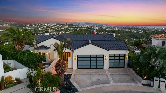 Immerse yourself in a lifestyle of luxury. 8 Via Goleta, is a profound estate located in the private guard gated community of Sea Pointe Estates. Tucked away on the hillside of a cul-de-sac street with captivating panoramic hill and ocean views. A striking granite wall leads you to the private gated entrance with a serene waterfall fountain feature. Step through the rain glass front door to the grand foyer that invites you to the main level living space that includes a large gourmet kitchen with handsome European cabinetry, a subzero refrigerator and dual wine refrigerators, dual dishwashers and ovens and a broad center island with stunning countertops. This main level offers a formal dining room, breakfast nook and a cozy family room with sweeping ocean and hill views with walls of La Cantina doors that open to offer cool ocean breezes and coastal ambiance, while providing direct access to an extended balcony for dining el fresco. The East wing provides a Private Primary Retreat, featuring luxurious views, high ceilings an ensuite bath finished in stunning granite slabs, an over-sized walk-in shower, soaking tub with fireplace and a huge walk-in closet. This primary retreat also offers office quarters with an additional fireplace and access to a private courtyard and balcony featuring a jacuzzi spa. The downstairs features 4 additional bedrooms, two with their own baths. While the other two (one is currently being used as a gym) share a jack and jill bathroom. At the heart of this second level is a grand living room with a four-screen video wall, large recreation area, a d
