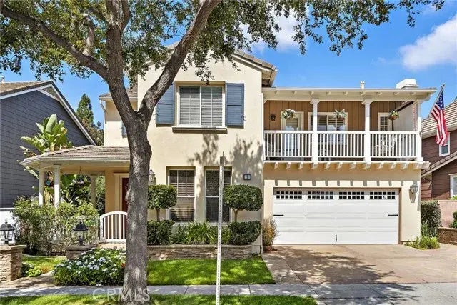 Located along the leafy tree-lined streets of Chimney Corners in Ladera Ranchs beautiful Flintridge village, this spacious upgraded home is completely turnkey. An old-fashioned wraparound porch with white picket gate offers a friendly introduction to the two-story residence, which backs to a lush hillside on a quiet cul-de-sac street. Inside, four bedrooms and three baths include a main-level bedroom that opens to the porch through custom leaded-glass French doors. The generous design is comfortably proportioned at approximately 2,526 square feet and features a formal living or dining room, and a cozy family room with built-in cabinetry, and a fireplace with raised hearth and traditional white mantle. Open to the family room, an updated kitchen shines with granite countertops, an updated bay window, a peninsula bar, island, a nook with backyard access and built-in desk, white cabinetry, and newer stainless steel appliances. Upstairs, an open loft and a versatile built-in office nook lend flexibility to the floorplan, while one bedroom opens to a balcony with front-yard views. Overlooking the backyard from a spacious balcony, the primary suite hosts two walk-in closets, a soaking tub and separate shower. Custom crown molding, designer paint and wallpaper, woodgrain plank flooring, handsome tile, plantation shutters and recessed lighting add style throughout. The Family room features built-in media niche w/ surround sound inclusive of the primary bedroom and backyard rock speakers. An epoxy-finished two-car garage includes ceiling racks and cabinetry, the second-floor laundry