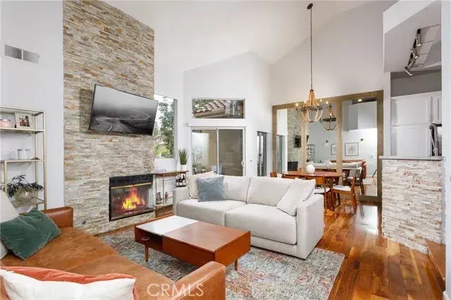 Look no further! This beautifully updated Palm Court condo features an open floorplan, high ceilings, and two private balconies perfect for enjoying the amazing coastal weather. Enter the front door and go left to the attached 1-car garage or go right into the main living area. The tasteful fixtures, ample natural light and cozy stone fireplace provide the space with a homey and elegant ambiance. The kitchen has upgraded cabnetry, quartz countertops and quality applicance. Enjoy the use of brand new washer/dryer, dishwasher, and oven. The primary bedroom and bathroom are on the main level. Upstairs you will find the secondary bedroom/loft with its private balcony and full bathroom. The community offers a resport style pool and spa, tennis courts and playground. In addition to the single car garage, tenants will get a parking permit for uncovered parking. The condo is ideally located minutes away from parks, award winning schools and plenty of dining, shopping and entertainment.