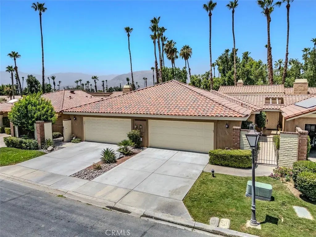 An exceptional location in one of the most prized communities in the Desert. This elegant Monterey Country Club property has designer touches that will truly elevate the living experience of its new Owner. Situated on a private green space and close to a very privately located pool and spa, this unit is also a short walk to the clubhouse, courts, workout facility and has a stunning combination view of the Santa Rosas and Mt. San Jacinto from its large back patio. The floorplan has a row of clerestory windows that bring in generous natural light and an atrium that was cleverly redesigned to be a private bar--this home has entertainment front and center. Granite countertops and high-end cabinetry with an abundance of storage, built in wine rack and ample counter space, this kitchen is ready to create amazing meals and host memorable gatherings. The primary bedroom has a closet system AND a drop-down staircase that leads to another dressing area in the finished attic space. The secondary bedroom is comfortable and functional as a secondary ensuite connected to the hall bathroom. Lastly, the office/den can sleep any additional overnight guests or serve as a cozy workspace and TV complete with NEW furniture and sleeper sofa. Enjoy the beautiful, sleek fireplace on cool evenings and the most spectacular sunsets from your back patio, complete with a built-in outdoor kitchen. Close to world class shopping and dining on El Paseo, the McCallum Theatre, Acrisure Arena, Eisenhower Medical Center and centrally located to Palm Springs and La Quinta---this is not a mirage! Come claim your