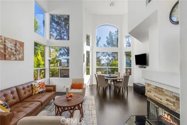 Welcome to your dream home in Aliso Viejos gated Eagle Pointe community. Step inside to soaring cathedral ceilings and a living space bathed in natural light. Upon entry, breathtaking views of the hills and mature trees abound. The spacious layout features beautiful hardwood flooring, fresh paint, and a cozy living room fireplace, perfect for unwinding. The kitchen is complete with a breakfast bar and stainless steel appliances, ideal for both casual meals and entertaining. Off the kitchen, you'll find a dining room and a bonus space that easily adapts as an open lounge, office or play area. All three bedrooms are upstairs, including the luxurious primary suite with dual sinks, a separate shower, a soaking tub, and ample closet space. Step outside sliding doors to a generous back patio, where a fireplace and BBQ create the perfect fresh-air environment to take in stunning city-light and hillside views. Upgrades in the home include a water softener system, RO drinking water, brand new HVAC system w/ smart thermostat, and garage epoxy. The Eagle Pointe community offers a pool, spa, playground, park, and is conveniently located amongst top-rated schools, shopping, and dining options.