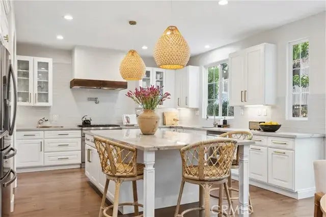 Nestled in the highly desirable Amberly Lane neighborhood of the Oak Knoll Village, this stunning corner lot home has unparalleled privacy and charm. The backyard evokes the ambiance of dining al fresco in Italy, with tranquil market lights, lush hanging vines, and vibrant landscaping featuring lemon, orange, cherry blossom trees, and fragrant camellias, hydrangeas, gardenias, and roses blooming in the spring. The professionally designed hardscape complements the natural beauty with its curvy wall and unique design. Inside, the home boasts a full-house repipe with PEX piping, fully owned solar panels, and a whole-house fan. The recent upgrades shine with a fully remodeled kitchen, including quartzite stone counters, custom white shaker-style cabinetry, soft-close drawers, glass subway tile backsplash, and a pot-filler faucet. High-end stainless steel appliances include a professional Thermador dual-cooking oven (steam and convection) that offers exceptional performance. This stunning home offers a versatile layout with a bedroom conveniently located on the main living level with an open and airy floor plan, high end designer chandeliers in the dinning room and office, abundant natural light, and custom media shelving in living space adding a modern touch. Throughout both stories, you'll find beautiful laminate wood flooring and fresh interior paint. The primary suite features 2 separate custom California closets, built-ins for shoes and laundry, and luxurious finishes. Upstairs youll find three bedrooms adorned with custom linen window coverings, along with an oversized lau