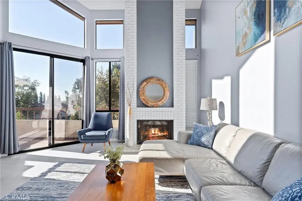 Spacious 2 Bed, 2 Bath Condo Plus a Loft which may be converted to a 3rd Bedroom!! Gated Community Near Golf Course & Lake ! Discover this stunning upper-level condo in the sought-after, gated community of Finisterra on the Green. Brimming with natural light, this beautifully updated home boasts soaring vaulted ceilings and ample storage throughout. The spacious main living area features dramatic floor-to-ceiling windows and a cozy brick fireplace that extends gracefully to the ceiling, creating an inviting ambiance. Step out onto the sunny patio, which offers peaceful views of the greenbelt, perfect for morning coffee or evening relaxation. The large primary bedroom includes a walk-in closet, providing both comfort and convenience. An adjacent dining area flows seamlessly from the living room, and a kitchen cutout opens up the space, ideal for entertaining. The kitchen, renovated in 2020, showcases modern cabinets, sleek quartz countertops, and a matching quartz backsplash. The same year, new waterproof luxury vinyl plank flooring was installed throughout, offering durability and style. A versatile loft addition makes an excellent home office or guest area, with the potential to be enclosed as an extra bedroom. This home includes a one-car detached garage with additional storage, plus a second covered parking space and plenty of guest parking. The Finisterra community offers resort-style amenities, including a pool, spa, putting green, BBQ areas, and more. As a member of Lake Mission Viejo, you'll have access to boating, fishing, concerts, and other recreational activities