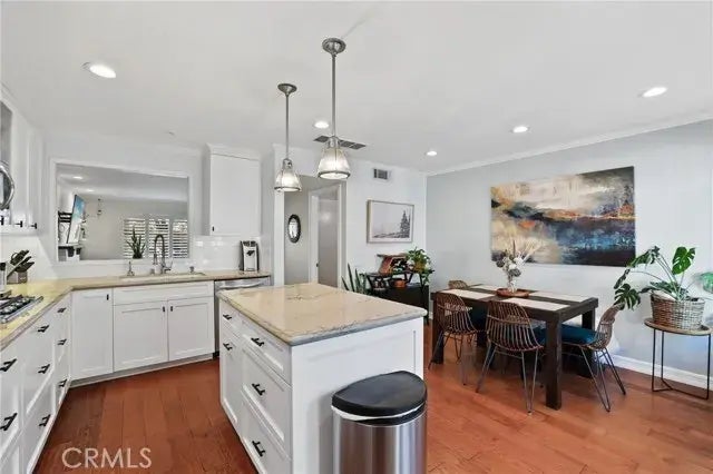 Charming Family Home with over $85,000 in Modern Upgrades! This beautifully remodeled townhome boasts an impressive array of features that blend style and comfort. It will be easy to relax and unwind as you enter the spacious family room, complete with a decorative faux fireplace and a charming wood mantel. Enjoy surround sound for movie nights and warm hardwood floors throughout. The oversized kitchen is sure to delight with a custom island illuminated by pendant lighting. The kitchen features sleek white self-closing cabinets with underlighting and decorative glass inserts, complemented by matte black hardware. Cook with ease using top-of-the-line KitchenAid stainless steel appliances, including a double oven and gas range, all set against a stylish subway tile backsplash and granite countertops. The eat-in nook offers a cozy space for casual meals, while an open niche seamlessly connects to the family room. The Primary bedroom features a built-out walk-in closet and a ceiling fan for added comfort. The wood laminate flooring adds a touch of elegance, making this space a perfect sanctuary. The versatile secondary bedroom offers an extra-deep closet for ample storage, a ceiling fan, and cozy shutters, all enhanced by wood laminate flooring. A full bathroom nearby features a tiled shower with a tub, a shaker design vanity, and a granite countertop with an undermount sink. Step outside your private outdoor oasis patio surrounded by a stylish vinyl fence and featuring beautiful tile work. Relax by the soothing water fountain or take advantage of the plumbed gas line for outdo