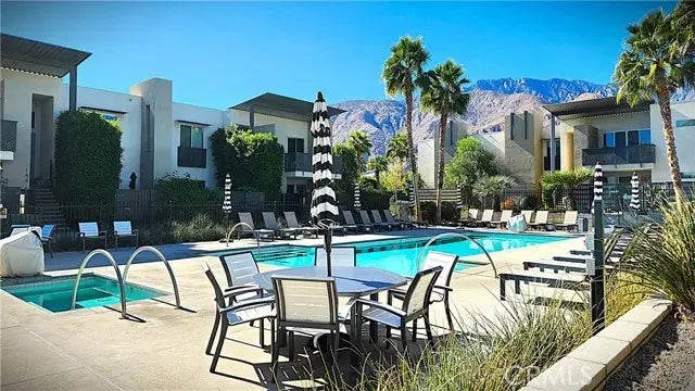 Experience resort-style living at 64 @ The Riva stunning, modern, gated community just moments from downtown Palm Springs. This first-level, open-concept condo offers two spacious primary bedrooms and an additional half-bath for guests. Upon entry, a private, gated front patio leads to a welcoming great room featuring an open gourmet kitchen, living, and dining area. Perfect for entertaining, this home boasts a large kitchen island, a dedicated dining space, and an inviting outdoor covered patio. Luxury amenities include a resort-style pool and spa, outdoor grilling stations, bathrooms with showers, EV charging stations, and a dog park with panoramic mountain views. Each primary suite is designed for comfort, offering walk-in closets with built-in organizers. The home incorporates eco-friendly touches, such as low-e glass windows, energy-efficient LED lighting, and a tankless water heater. Designed for seamless indoor-outdoor living, this condo features 9-foot ceilings with exposed beams, 8-foot sliding glass doors, quartz countertops, custom cabinetry, and a stylish backsplash. Enjoy the vibrant Palm Springs lifestyle with endless dining options, upscale shopping, and recreational activities at your fingertips.