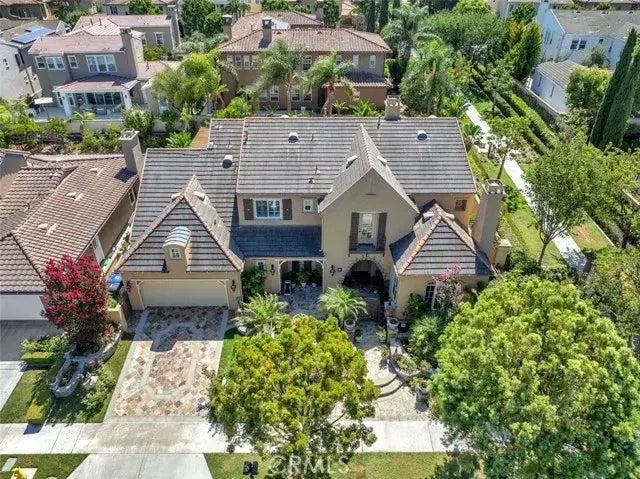 Welcome in the exclusive, 24-hour guard-gated enclave of Bonita Canyon, offering one of the largest, most coveted floor plans in the community. Sunlight floods the entire home, with natural light beaming into every room. Boasting nine spacious rooms, including five bedrooms (one a main-level suite with full bath and french doors to an outdoor oasis). This residence offers privacy and is ideal for large or multigenerational families, as well as those who enjoy entertaining on a grand scale. Formal family room boasts cathedral ceilings and cozy fireplace. The coffered ceiling in the formal dining room adds an extra touch of grandeur, while additional French doors open to front porch with fountain, creating a seamless blend of indoor/outdoor living. For added convenience, a quaint custom wood-built desk is situated off the kitchen. Large open floorplan has kitchen and living room with walls of windows and french doors. Two staircases lead to the upper level. The oversized sun-drenched master suite includes three walk-in closets, a spacious master bathroom with dual sinks, jacuzzi tub, and large walk-in shower. The professionally designed landscape showcases custom stonework, lush palms, exotic flowers, and serene fountains, creating an atmosphere of pure tranquility. This private paradise offers an outdoor kitchen fully equipped with BBQ, burners, a sink, and refrigerator, expansive lanai with a full bar, custom lighting, and imported fountains. Custom rod iron gates and fencing frame the front and backyard oasis. Upper and lower decks are thoughtfully designed for hosting liv