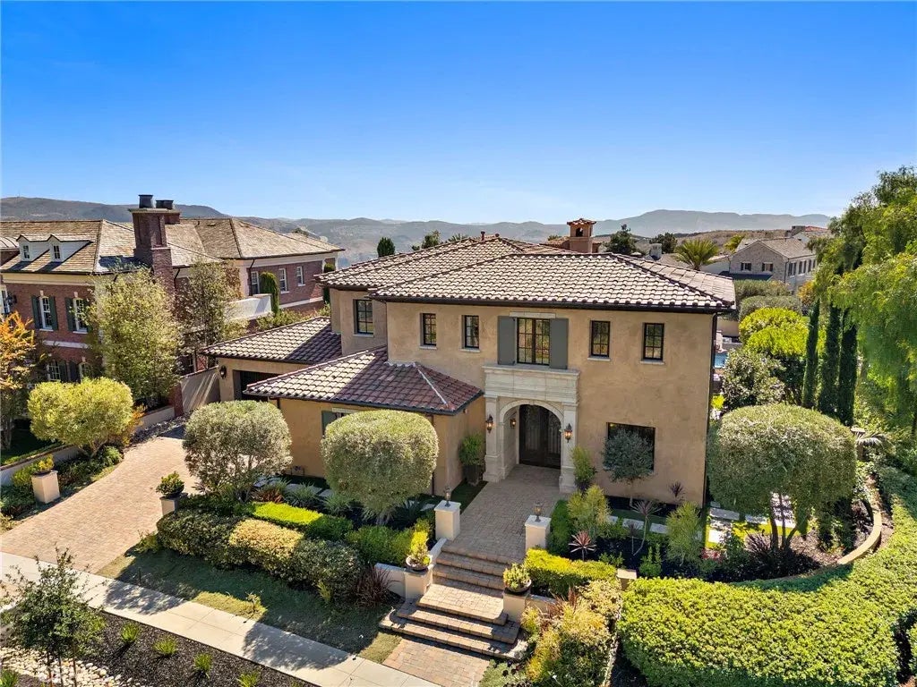 Stately and sophisticated, this recently renovated custom residence is among the most desirable in Ladera Ranchs guard-gated Covenant Hills. Occupying a premier corner site, the home recalls the timeless appeal of grand Beverly Hills & Hancock Park estates with authentically detailed architecture that harmonizes with lush gardens, olive trees and custom hardscaping. Arched glass and wrought-iron entry doors open to a stunning living environment that is modern and warm. A two-story foyer with sweeping staircase continues to a seamless living area. Custom beamed and barrel ceilings accentuate an expansive great room featuring formal dining, billiards area, 206-bottle glass wine display, and polished stone fireplace. A magnificent kitchen displays an oversized quartzite island, farmhouse sink, and breakfast nook that opens to the backyard. Thermador appliances include dual built-in ovens, two dishwashers, a wine refrigerator, six-burner range and built-in refrigerator. A large laundry and mud room features marble countertops and top-end appliances. Five bedrooms and four- and one-half baths provide comfort and privacy for all in approx 5,575 sqft. One bedroom is located on the first floor with ensuite bath, and the others are featured upstairs. Guests will appreciate a junior suite with ensuite bath and walk-in closet, two additional guest bedrooms, and a versatile media room. Offering a peek at the ocean, the resort-caliber primary suite elevates personal luxury with a view balcony, fireplace, dual vanities and freestanding tub. Primary closets include an additional refrigera