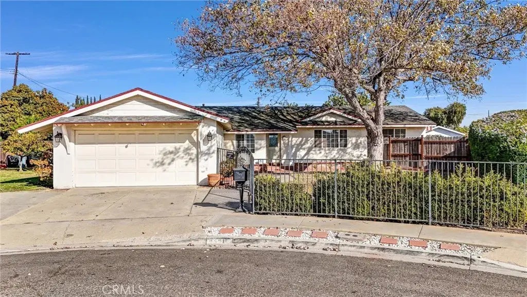 Located in a peaceful cul-de-sac, this charming single-story home is ready to be transformed into your dream residence. The spacious living room, featuring real wood flooring, flows seamlessly into a large kitchen, ideal for hosting family and friends. The open-concept kitchen boasts Corian countertops, a double sink, and a garden window overlooking the backyard. Additional highlights include dual-pane windows, hardwood flooring, an upgraded Trane heating and air conditioning system, and a recently installed water heater. French doors in the living room open to a sprawling backyard filled with mature fruit trees, including apple, lemon, grapefruit, navel orange, and pomegranate. The gated front yard is shaded by a majestic silver maple tree, adding to the homes curb appeal. With ample space to expand and tons of natural light this property offers endless possibilities in a prime cul-de-sac location!