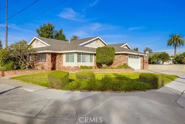 Welcome to this beautiful 4 bedroom and 2 bath single-family home located in the highly sought-after neighborhood of Garden Grove! Featuring excellent curb appeal, a brick facade, and a gated entry, the home welcomes you into a bright family room with a large brick fireplace, vinyl wood flooring, plenty of natural light from colonial-style windows and fresh paint throughout. A charming cutout half-wall separates the family room from the formal dining area, creating an open yet cozy atmosphere. The kitchen offers a breakfast bar, tile countertops, natural wood cabinetry, stainless-steel wall oven, and gas stovetop. Corner windows over the sink provides a lot of natural light. The dining area, with a ceiling fan and sliding glass doors, leads to a private courtyard with a lush yard that wraps around the house with ample space for outdoor entertaining and dining al fresco. The master bedroom is spacious with new carpet, two windows, and a large closet. The master bathroom features a dual-sink vanity. Two of the three additional bedrooms are newly carpeted, with large closets and natural light, while the fourth bedroom showcase wood flooring. The second full bathroom includes tile flooring, a dual-sink vanity, a bathtub, and a separate walk-in shower. The private backyard features mature trees, an ivy-covered brick wall, and a shed for additional storage. A large brick-built gas grill adds to the charm of the patio, while the spacious yard offers room for RV or extra parking through a gated entry. The two-car garage offers built-in storage, a workbench, and the water heater. Wi