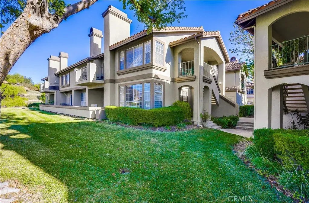 Welcome to 15 San Angelo, a 2-bedroom, 2-bathroom, 1,027 sq. ft. corner unit condo featuring timeless Spanish-style architecture with a stucco exterior and tile roofing, nestled in a serene, well-maintained community with nicely treed green spaces. The homes upstairs entry invites you to a spacious front porch, perfect for a cozy seating area or a collection of plants. Inside, the open-concept living and dining area is bright and inviting, with vaulted ceilings, a fireplace, and plenty of natural light from windows on two walls. Sliding glass doors in the dining area lead to a private back porch overlooking the treed community and open spaces. The kitchen offers a practical layout with a breakfast bar, ample cabinet storage, and tile countertops. The first bedroom, accessed through double doors, has high ceilings, unique textured glass interior windows, and nearby access to a full bathroom with a tub/shower combo and single-sink vanity. The primary bedroom features vaulted ceilings, dual closets, and an en-suite bathroom with a dual-sink vanity, a tub/shower combo, and a separate water closet. Additional conveniences include an in-unit laundry room with storage and access to the water heater, plus an attached one-car garage. This home combines charming design with practical living in a serene community close to dining, shopping, and outdoor recreation. Dont miss the opportunity to make this corner unit your own!
