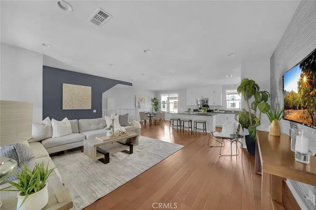 Introducing the Classic Cariz, a former model home from the latest collection of modern townhomes. This stylish residence features wood floors, recessed lighting, designer window coverings and shutters throughout. The second floor boasts a bright, open living space with a well-appointed kitchen and a spacious dining room perfect for entertaining. Step out onto the large balcony for a relaxing outdoor space. The chefs kitchen is equipped with beautiful quartz countertops and backsplash, a breakfast bar, stainless steel appliances, upgraded cabinetry, and designer light fixtures. The master suite, with large windows and a walk-in closet, is both bright and inviting. The master bath includes neutral tile floors, quartz dual vanities, and a walk-in glass shower. Generously sized secondary bedrooms feature ceiling fans and share a bathroom with double sink vanities and a tub/shower combination. The home also offers a two-car tandem garage. Residents enjoy resort-like amenities including a pool, spa, clubhouse, picnic area, and playgrounds, all just steps away. Conveniently located near shopping, dining, entertainment, and toll roads, this community is served by award-winning Irvine schools, including Portola Springs Elementary, Jeffrey Trail Middle School, and Portola High School.
