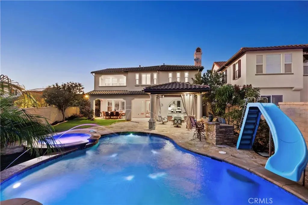 Enjoy this STUNNING POOL entertainers home, with an 8,795 SqFt, CORNER lot and popular floor plan, 5 bedrooms (3 bedrooms upstairs) + Office & 2 fireplaces-including one bed and bath on the main level- featuring a sparkling saltwater Pool & Spa with waterfalls and waterslide, a golf putting green, a built-in & newer BBQ island and an indoor/outdoor vibe Capistrano room with a built-in heater and outdoor surround sound. This grand lot is laced with custom stone hardscape and surrounded with multi-color roses and blossoming fruit trees including apple, pomegranate, grapes, peach, blood orange, avocado and citrus. This in demand floor plan offers 5 bedrooms-including one bedroom and bath on the main level -plus a separate master retreat off the master bedroom which can be a spacious office or den. Enjoy your morning coffee in the morning room off the kitchen with its own fireplace and large glass windows with views of the pool. The gourmet kitchen offers a spacious kitchen island laced with a custom lit up quartz countertop and WOLF stainless steel appliances including a cappuccino maker. Home has many upgrades throughout including plantation shutters, central vac system, built-in surround sound, custom built-ins and custom interior lights. The master bathroom features his and her vanities, a jetted spa tub a spacious walk-in shower and has a very large walk-in closet with custom built-ins. Further features to this home include a 3-car tandem garage with epoxy flooring, water filtration water softener system, two fireplaces-including one in the master bedroom-a side courtyard