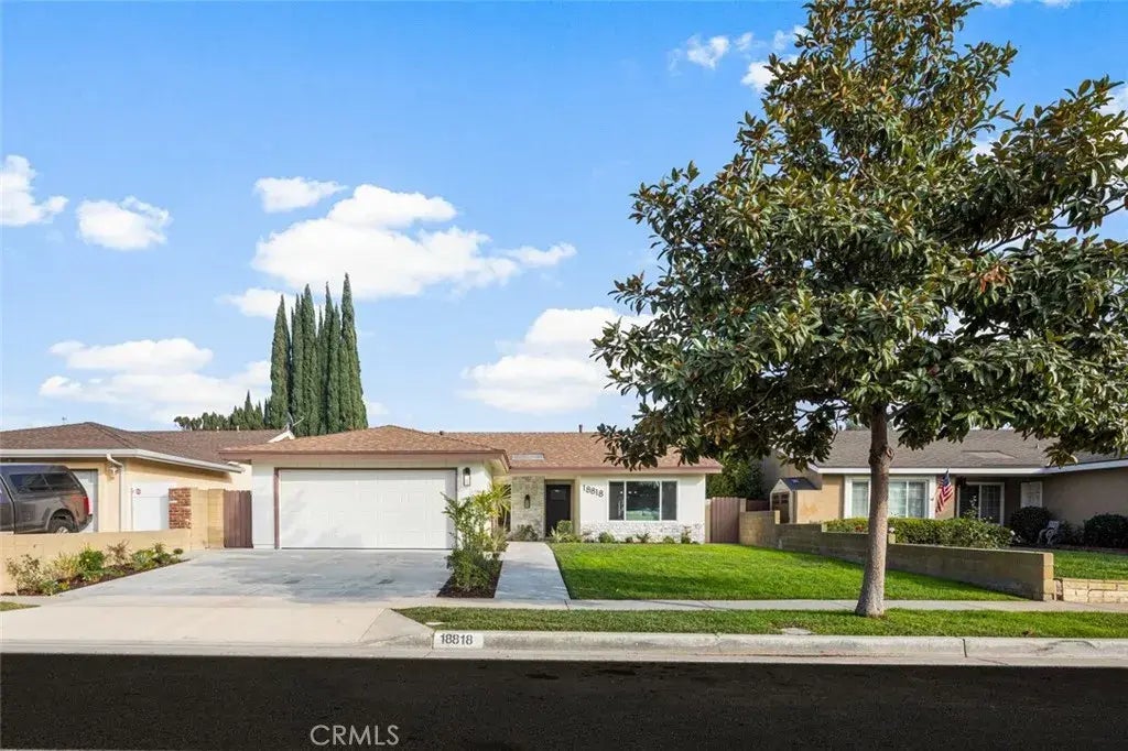18818 Castle presents an amazing 4 bedroom 2 bath, single story home, that has undergone an extensive remodel. This home is situated on a quiet cul-de-sac street with underground utility lines, a lovely park within walking distance and fantastic shopping and freeway accessibility. A large front yard, upgraded concrete driveway and newly painted exterior, presents a fresh and manicured curb appeal. Upon entry, you are greeted by new coastal wood grain luxury vinyl plank flooring throughout, new LED recessed lighting, dual pane windows throughout and designer paint colors. Your living room and casual dining room enjoy wonderful natural daylight and are conveniently situation adjacent to the kitchen. The new kitchen features white shaker cabinetry, quartz countertops, stainless steel appliances, a peninsula with bar top seating, and pendant lighting, a window over the sink and a sliding glass door to the private rear yard. Your primary bedroom enjoys a newly renovated primary bathroom with a deluxe glass enclosed shower and designer tile. Three spacious additional guest bedrooms share a second fully remodeled guest bathroom with a soaking tub. The rear yard delivers a tranquil setting, consisting of a covered concrete patio area and lush manicured grass. Additional features include: New AC, New furnace and a finished garage with epoxy flooring.