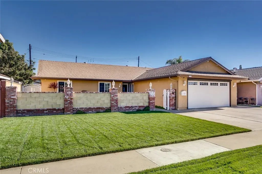 This lovely beach home resides on a quiet cul-de-sac, while offering really nice curb appeal and plenty of quality upgrades. As you drive up, you are greeted by a well manicured front lawn and a private front court yard. Once inside, there is a large dining area to the right, adjacent to the kitchen. The kitchen offers updated cabinetry, Corian countertops and stainless steel appliances with a built-in microwave. Next comes the formal living room with a slider to the rear patio + plantation shutters. The hall bathroom has an updated shower enclosure and vanity. The bedrooms are all nice sized and come with mirrored closet doors + carpeting. The primary bedroom is separated from the other bed's and offers an updated primary bathroom. Bonus features include; smooth ceilings, crown moldings, plantation shutters, new interior doors, wood and tile flooring, dual pane windows & slider, updated copper plumbing, a new front door and security screen, newer heating & A/C, rain gutters plus the garage comes with built-in cabinetry, pull down storage access, an electric screen and an epoxy floor. There is also a very private rear yard with a large patio, lawn, storage shed, timed sprinkler system and block wall fencing all around. This fabulous home is walking distance to award winning schools, a park, golf, shopping, restaurants and is only a 5 minute drive to the beach or the Bella Terra Mall!
