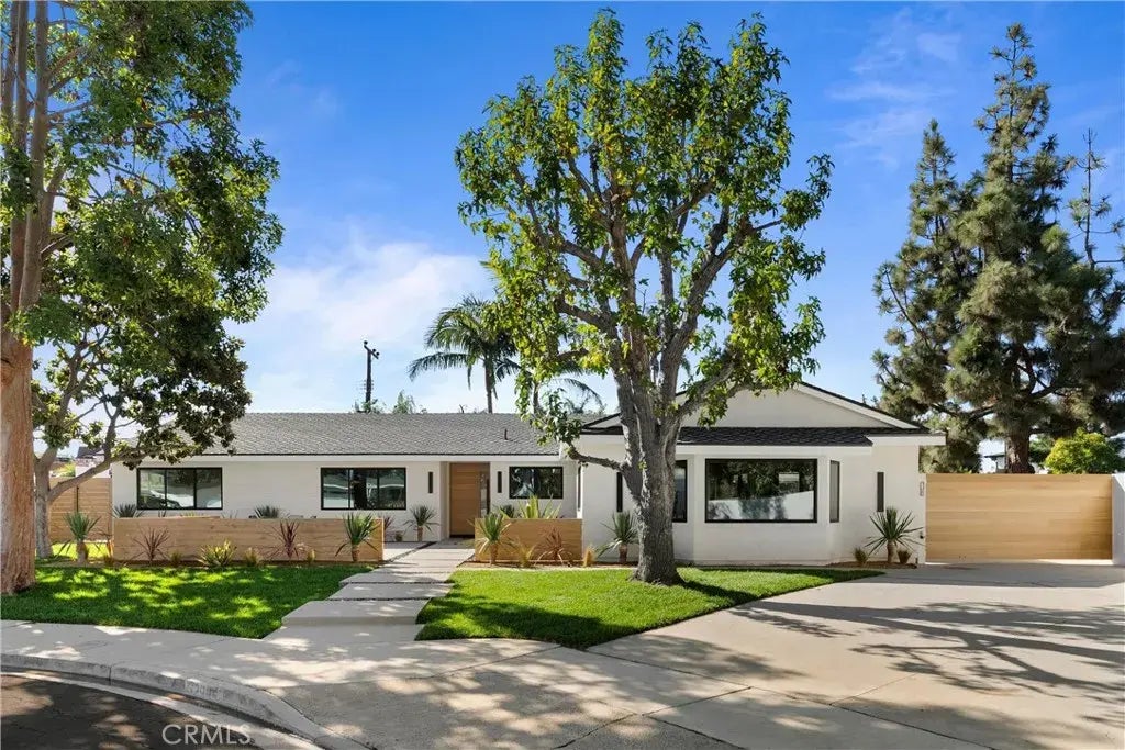 Incredible single-story five bedroom (4 Plus office), 3 bath home at the end of a cul-de-sac. Total remodel in 2024. Single story floor plan that was rebuilt from the ground up in 2024, this home features an open floor plan through much of the living area. The custom kitchen is fit for a chef with large 48 inch thermador gas range, a pot filler above the range, custom hood, built-in sub-zero fridge, and large center island with seating and prep sink. The kitchen is centered in the great room/ family room that features custom stained wood beams on the cathedral style ceiling and looks into the front of the home. A large second living area is adjacent to the great room, and has ample space for a sectional couch, casual dining area, and features an accordion style foldable door to the backyard. If security and privacy are important, this home has got it - a large automatic security gate provides access to the long private driveway (perfect spot for the kids to play) and the detached garage in the rear. A convenient access point adjacent to the kitchen is great for loading groceries and features built-in EV charging. The secondary bedrooms are ample sized for this neighborhood, and share a private hall bathroom. The primary bedroom is quite large, and has a custom walk-in closet that features a makeup mirror desk. The primary bath has an oversized shower with mutiple shower heads, a private water closet, and a dual sink vanity perfect for you and your partner. The backyard is significant with new a new drainage system, fresh grass, and new tropical plantings. The oversized two