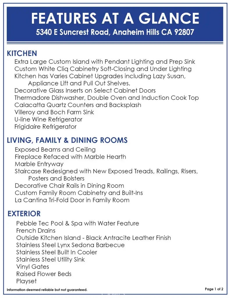 Welcome to this exquisite residence in Anaheim Hills thats been architecturally reimagined with meticulous attention to details. Home features 4BR lrg bonus room 3RR 3car-gar pool/spa. Open concept home with grand remodeled chefs kitchen. A showstopper designed for both elegance & practicality. At center is massive custom island illuminated by pendant lighting providing generous space for both meal prep & entertaining. Dedicated prep sink Calacatta quartz countertops & Villeroy Boch Farm Sink combine luxury with utility. Thermador appliances:double oven induction cooktop & dishwasher plus U-Line wine fridge. White Cliq cabinetry adds to kitchens sophistication soft-close drawers decorative glass inserts & under-cabinet lighting that sets ambiance. Design touches, like a lazy Susan appliance lift & pull-out shelves make kitchen not only beautiful but functional. Beautiful LR features exposed beam ceilings marble-refaced fireplace & redesigned staircase w/exposed modern treads/railings/bolsters. Expanded DR offers space for entertaining while adjacent FR provides views into kitchen & backyard. Built-in features in FR provide added storage & LaCantina tri-fold doors open to outdoor living space blurring lines between indoor/outdoor living. Main-floor BR w/Pella sliding doors lead to resort-like backyard complemented by remodeled bath w/white subway-tiled shower. Primary bedroom features double doors, plush new carpet, an Elfa Closet system Levlor blinds & Mimika ceiling fan. Redesigned primary bath has custom cabinets, marble countertops, dual sinks, modern lighting & generous