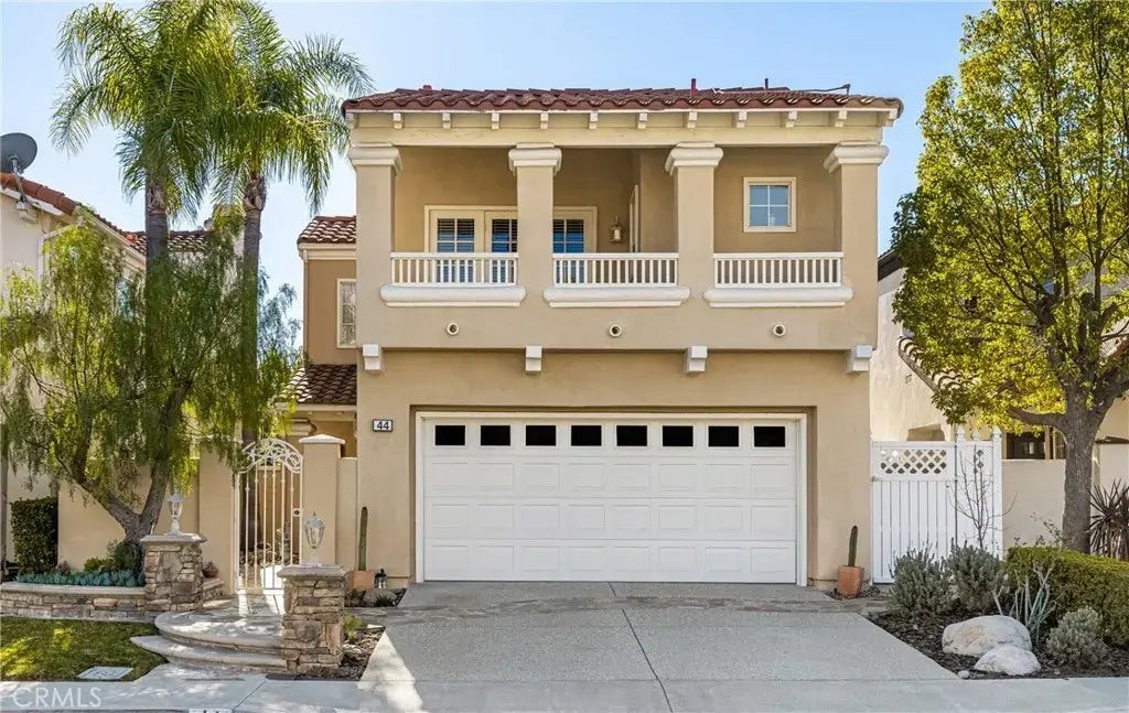 Discover your dream home in the rolling hills of Foothill Ranch! Nestled on a peaceful, tree-lined cul-de-sac with no neighbors behind, this home offers unparalleled privacy. The charming curb appeal features manicured landscaping and professional hardscaping, including stone pilasters, planters, and walkways. Enter through a private, gated courtyard that sets the tone for the home's elegance. The vibrant backyard is perfect for indoor-outdoor living, with breathtaking panoramic city lights and romantic sunset views. This home boasts three bedrooms, including a downstairs bedroom/office with French doors ideal for overnight guests, and three full bathrooms within 1,672 sqft of comfortable living space. Step inside to an inviting open layout with high ceilings, abundant windows filling the space with natural light, and a stunning custom staircase. Impeccable craftsmanship is evident throughout, with Mohawk hardwood flooring, extensive wainscoting, plantation shutters, custom window coverings, French doors, upgraded light fixtures, some vinyl windows, custom sliding doors, a new garage door, seller-owned solar panels, a newer A/C unit, and ceiling fans. The living room is a standout feature, with soaring ceilings and a cozy fireplace creating a warm, welcoming atmosphere. The remodeled kitchen includes granite countertops, a stone backsplash, refinished cabinets, and a large custom window in the dining area. Additional conveniences include an inside laundry room. The primary suite offers a vaulted ceiling, a walk-in closet, dual vanities, a tiled shower enclosure, and a Frenc