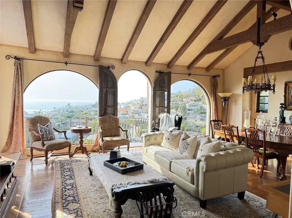 This is a stunning Spanish-style home with unmatched charm and breathtaking views! Heres an overview of the propertys highlights: Property Features: Architecture & Design: A 4-bedroom, 4-bath masterpiece designed by famed architect John ONeill, showcasing arched doorways, exposed wood beam vaulted ceilings, and timeless European artistry. Chefs Kitchen: Equipped with top-of-the-line appliances, including a 6-burner Viking stove, custom cabinetry, and a cozy breakfast nook with a built-in bench. Panoramic Views: Spectacular ocean and city light views from almost every room. The great room features high-arched windows and a warm stone fireplace, creating a picturesque atmosphere. Luxurious Master Suite: Includes a private retreat, a cozy fireplace, and stunning ocean views. Outdoor Living: Expansive wrap-around patio, an outdoor fireplace, and tranquil spaces to enjoy the serenity and sunsets over the Pacific. Additional Spaces: Maids or in-law quarters with a kitchenette, antique fixtures, and multiple fireplaces throughout. Prime Location: Close proximity to Laguna Beachs best beaches, shopping, restaurants, and art galleries. Owner have very expensive carpets in the house So no pets allowed.