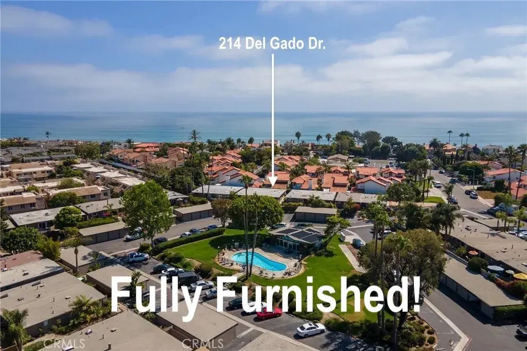 Welcome to 214 Del Gado Rd, 6-9 month term preferred, Fully Furnished mid-century modern oasis located less than a mile from the sand with easy access to San Clementes laid-back lifestyle. Nestled in the highly sought after private community of Vista Del Gado in North San Clemente, this home has everything needed to walk in and feel at home. From the airy and private front patio, enter through French doors into an open floor plan with newer luxury vinyl plank flooring throughout. The kitchen opens to the living and dining areas with granite countertops and bar seating, ample storage, and stainless appliances. The hall bathroom is flooded with natural light and conveniently has a dual vanity with cabinet storage plus a walk-in shower and skylight. The spacious primary bedroom has a king size bed with two wall shelves on an accent brick wall with sliding door to the back patio, this bedroom also has its own private half bath. The secondary bedroom has a queen bed also with direct access to the back patio. Other notable features include central air conditioning, laundry, and dual paned windows & doors with encased blinds. Community amenities include a solar heated saltwater pool, clubhouse, park, and grounds maintenance. One assigned space + detached 1-car garage and ample guest parking. Furniture is not negotiable, it must be included with the rental.
